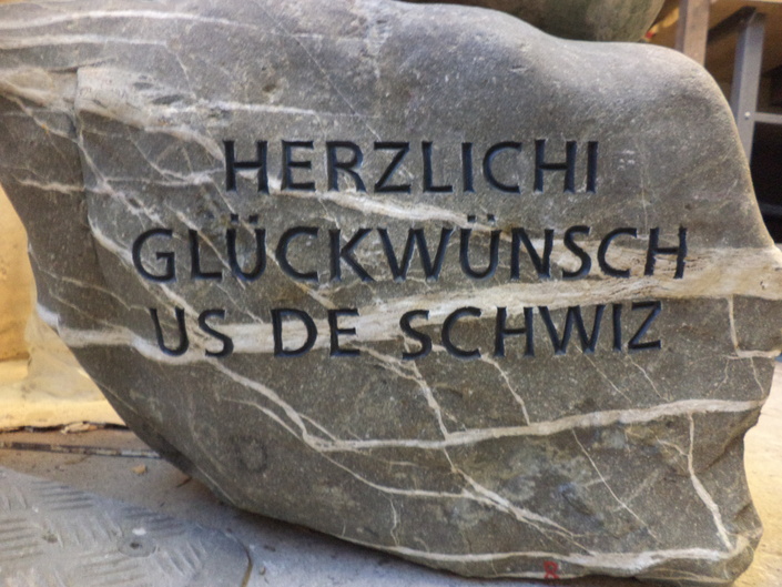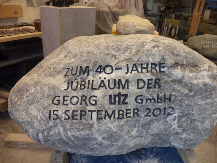 Zum 40-jährigen Jubiläum der Firma UTZ AG in Schüttdorf wurden individuell durch uns ausgesuchte Steine graviert, nach Deutschland transportiert und vor Ort von uns aufgebaut.